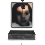 Dans l’œuvre Tiroir (1988), l’artiste associe un tiroir rempli d’habits avec une photographie floue, un portrait juvénile très serré, surmonté et éclairé par une simple lampe. Cette installation évoque un autel ou un monument commémoratif qui rendrait hommage à une personne proche disparue et incarnant, par sa mise en scène, une représentation sacrée de l’être humain. Comme le souligne l’historienne de l’art Catherine Grenier, la pratique de Christian Boltanski est “obsédé[e] par l’idée de la perte et de la disparition1“ ; le corps ne peut s’y manifester pleinement, l’artiste préférant souligner son absence.