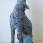 Ce loup d’apparence féroce est transformé en bibelot de céramique, si fragile intrinsèquement. Il est aussi muselé par une camisole élégamment crochetée.