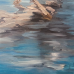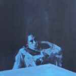 Au sein d’un polyptyque peint, la figure de Jasper John embué par l’ennui lors d’un vernissage est répété et décliné sur quatre toiles. Vaporeux sur les supports extérieurs, son image et sa silhouette se diluent progressivement dans la matière picturale des tableaux centraux. L’ensemble a été réalisé à partir d’une photographie réinvestie par la peinture. Au moyen d’une mise au carreau, l’artiste Youcef Korichi agrandit le modèle original, le répète et le déconstruit au sein d’une succession de toiles. Loin d’être corrigé, le flou à l’œuvre dans le modèle original est rejoué et exacerbé pour plonger le spectateur au cœur d’un jeu de surfaces et textures, au plus près de la matière.